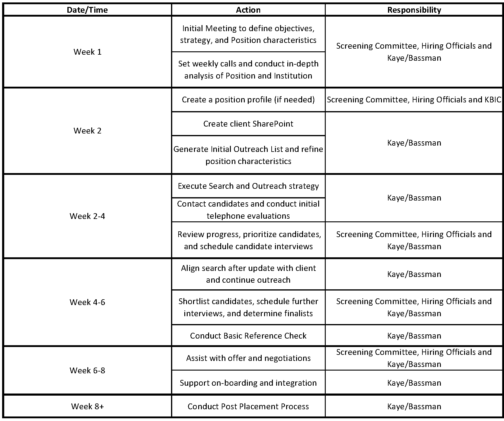 Kaye/Bassman project leaders will coordinate with you on communication strategies and will be able to provide advice on cost-effective ways to conduct a high-quality search. Kaye/Bassman’s authorized project lead will be available 24-hours per day for contact by your institution and well-qualified candidates for every search. All forms of communication (email, phone, etc.) will be directed to KBIC project lead who will respond within at least 24-hours.